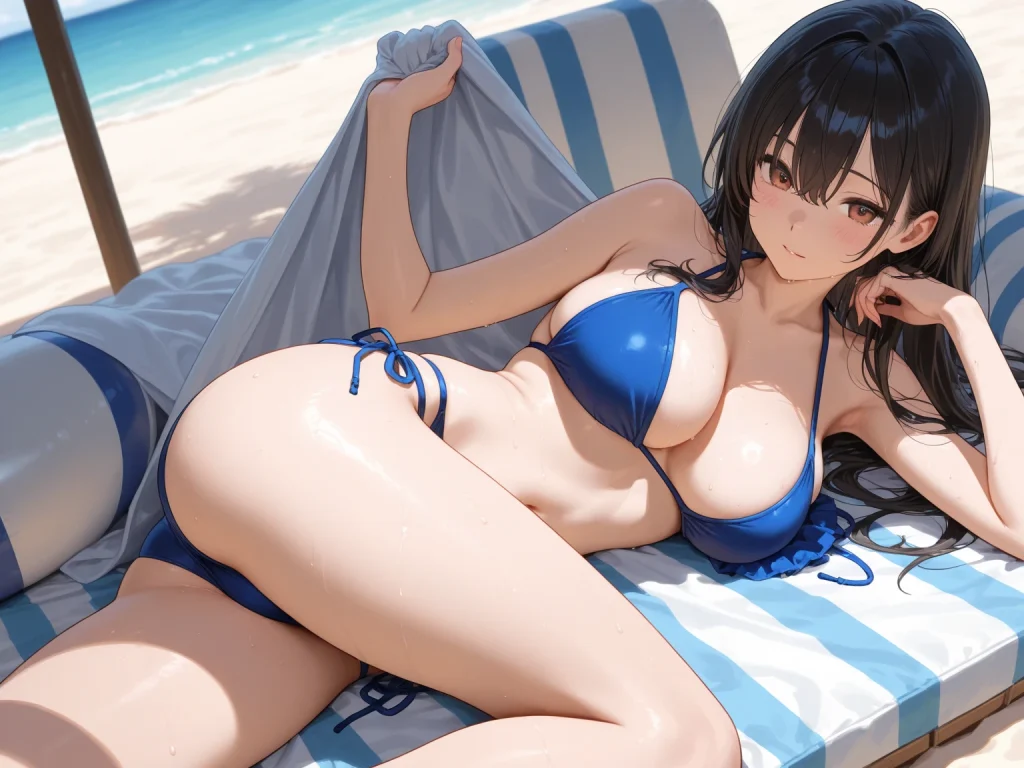 マイクロビキニシーンでは、パイズリ抜きが展開される。衣装は、あどけなさを残すしましま柄のビキニ。ふわふわとした素材感で、彼女の豊満なバストを支えるにはどこか心許なく、少し動いただけでズレてしまいそうな不安定さが、強く視線を引きつけるビジュアルだ。